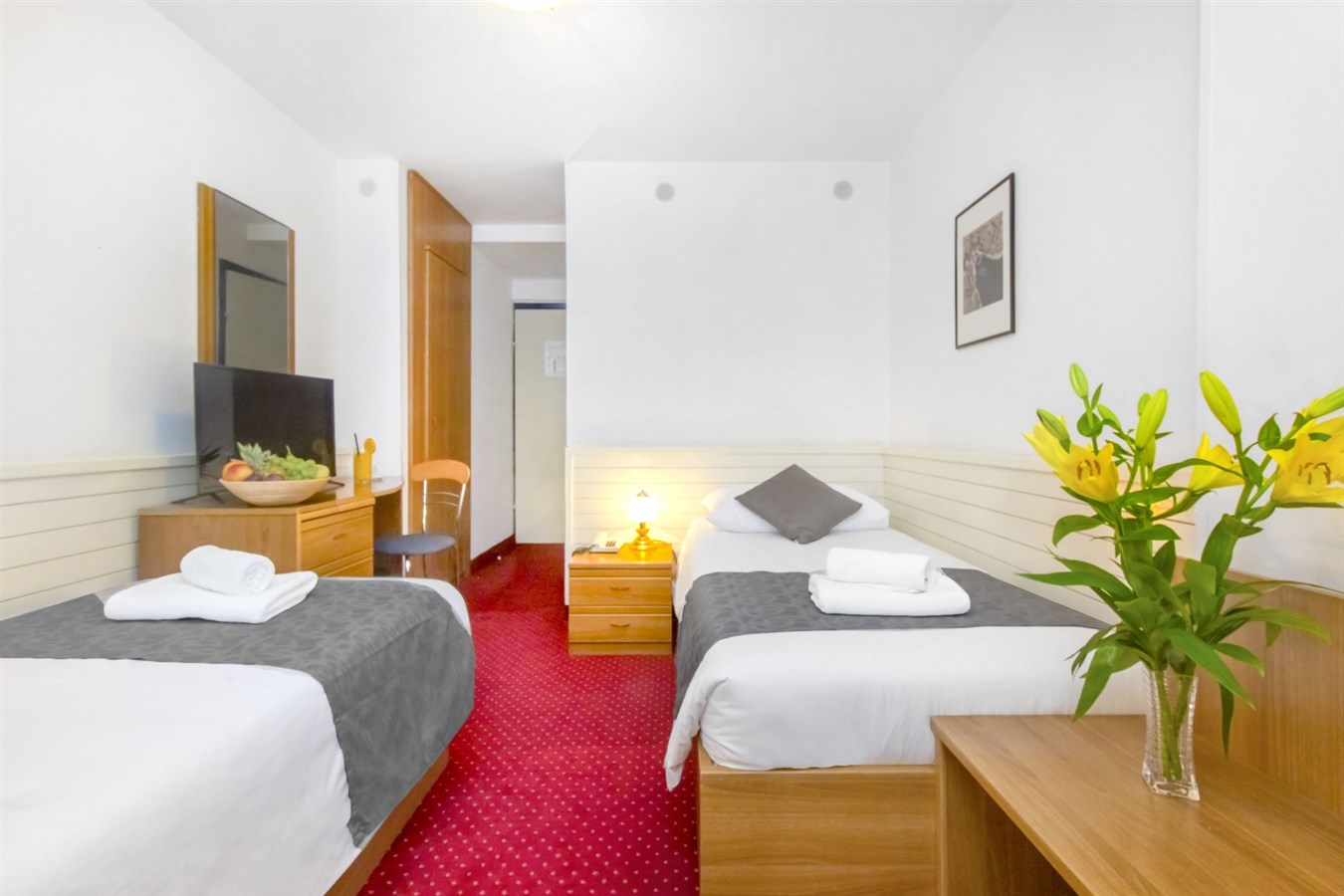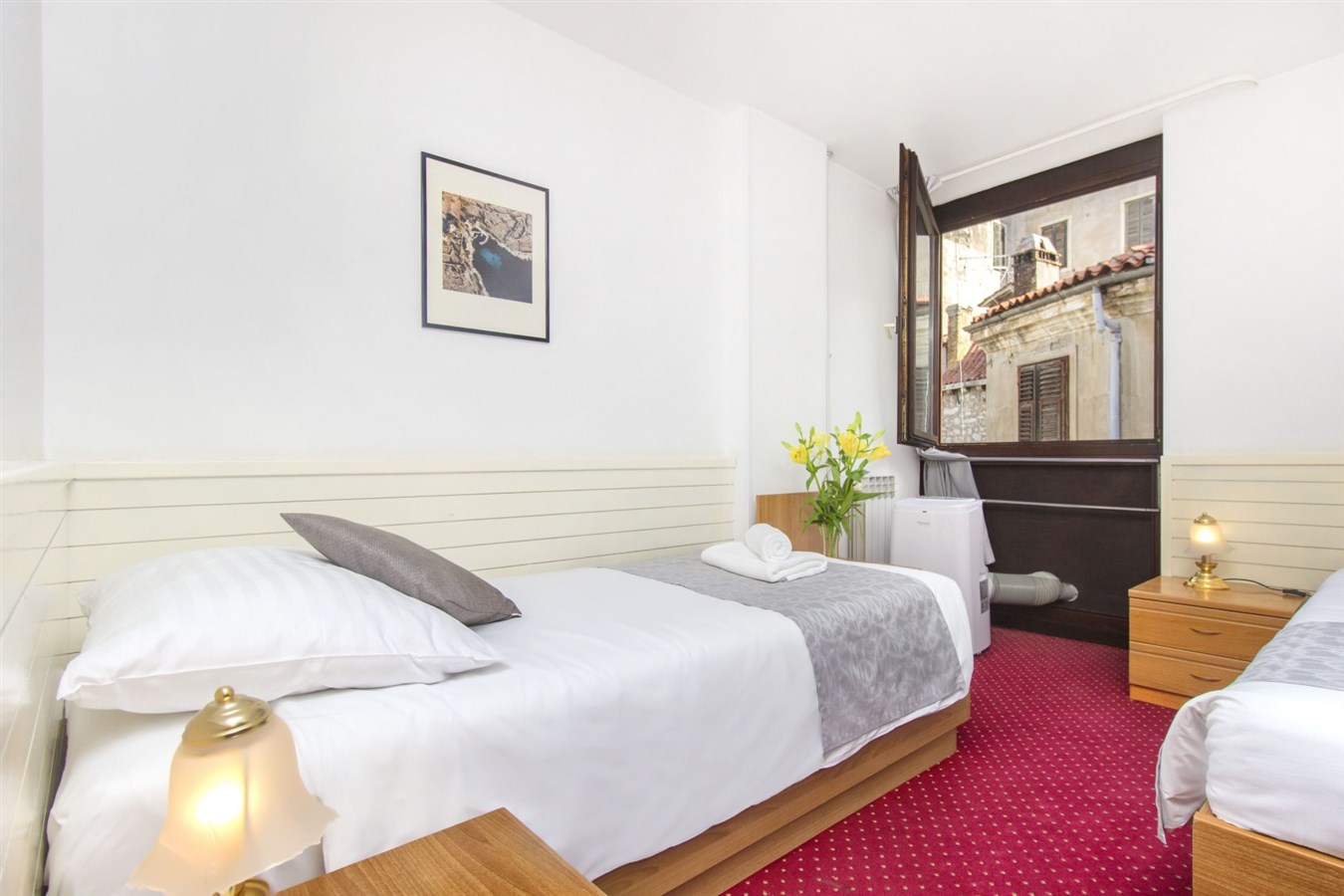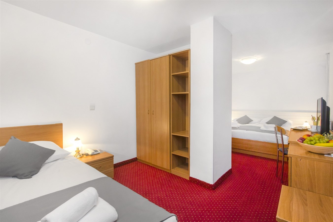 Klimatizované dvoulůžkové, třílůžkové či jednolůžkové pokoje s vlastním příslušenstvím, SAT/TV, telefonem a wifi připojením. Pokoje jsou bez balkonu. Dětská postýlka k zapůjčení za poplatek.