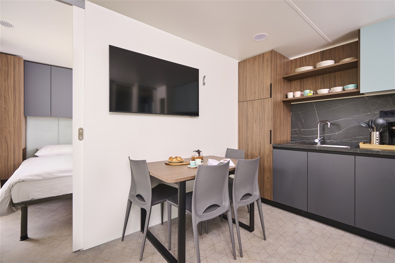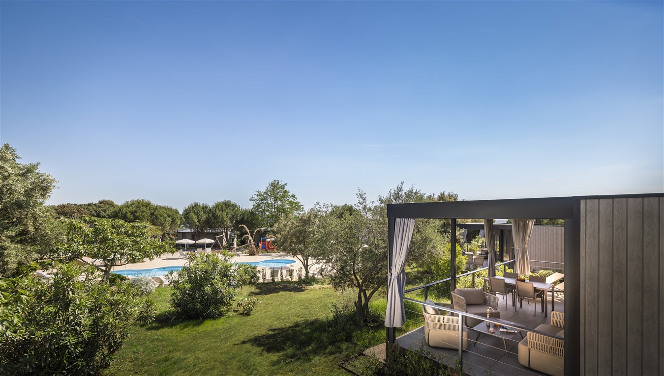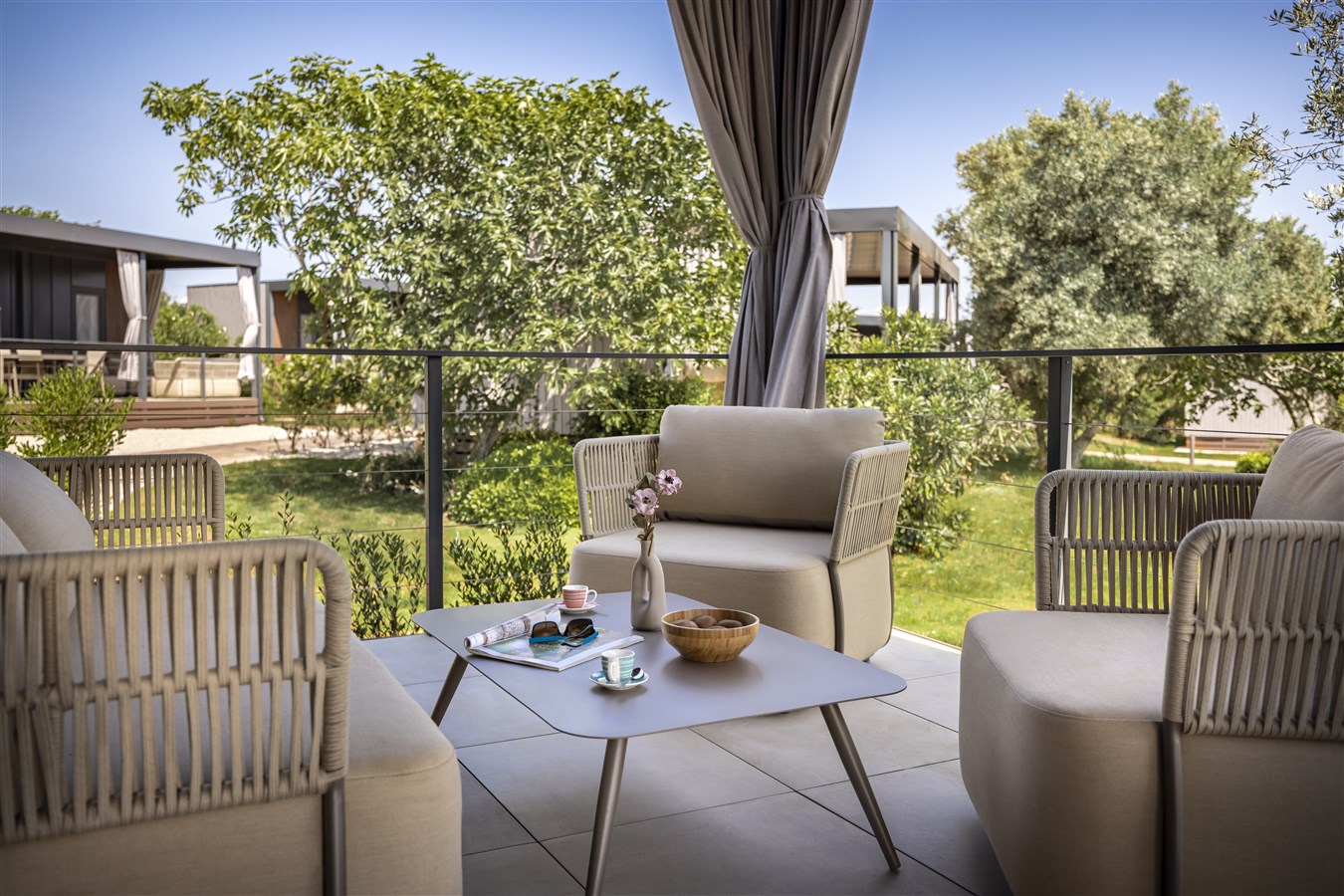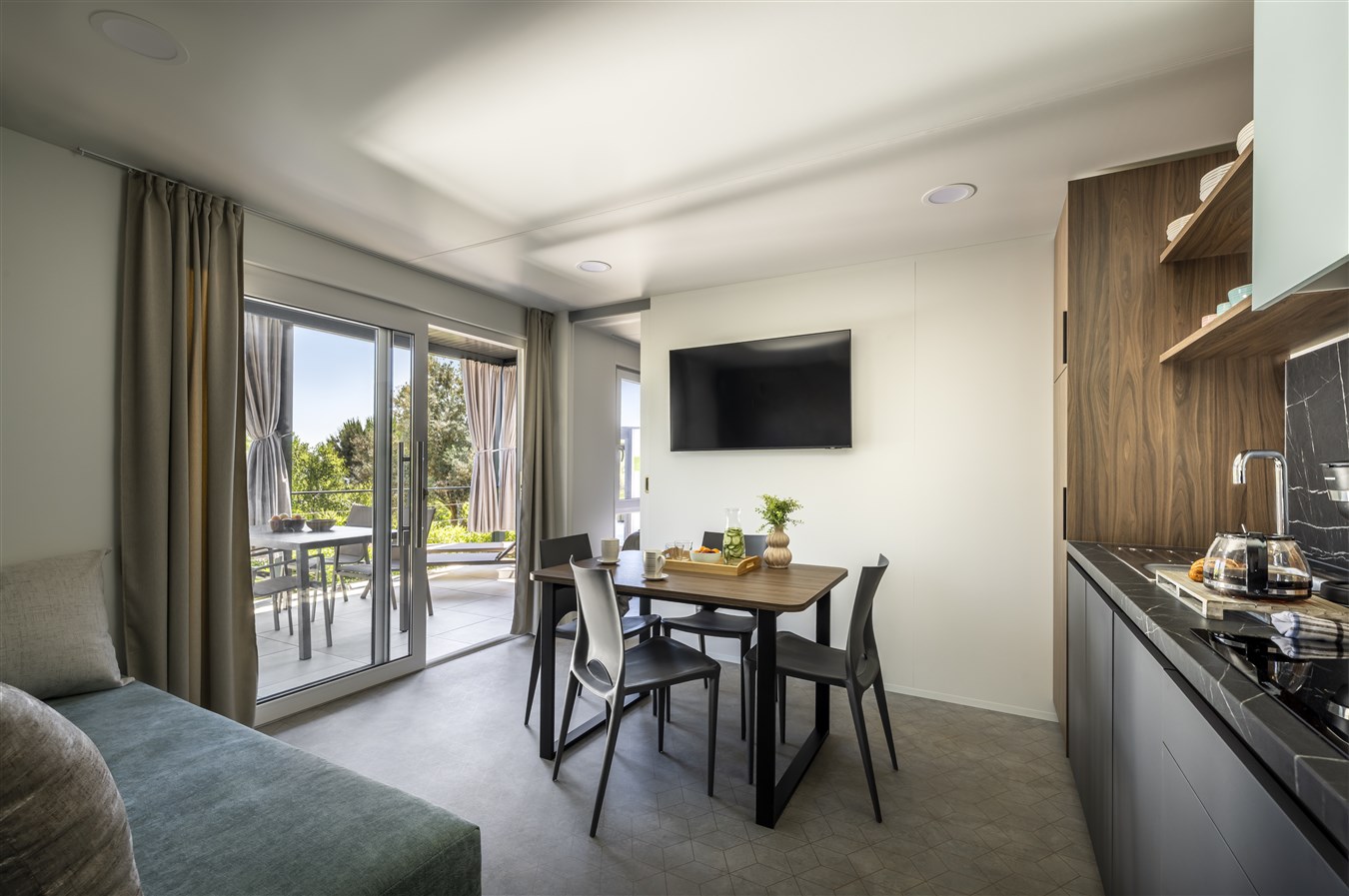 Mobilní domky jsou nově vybavené a nabízejí dva pokoje (jeden s manželskou postelí a druhý s oddělenými lůžky), obývací část s rozkládacím gaučem pro 1 osobu, plně vybavenou kuchyň, 2 koupelny se sprchovým koutem, SAT TV, klimatizaci, trezor, Wi-Fi a terasu se zahradním nábytkem.