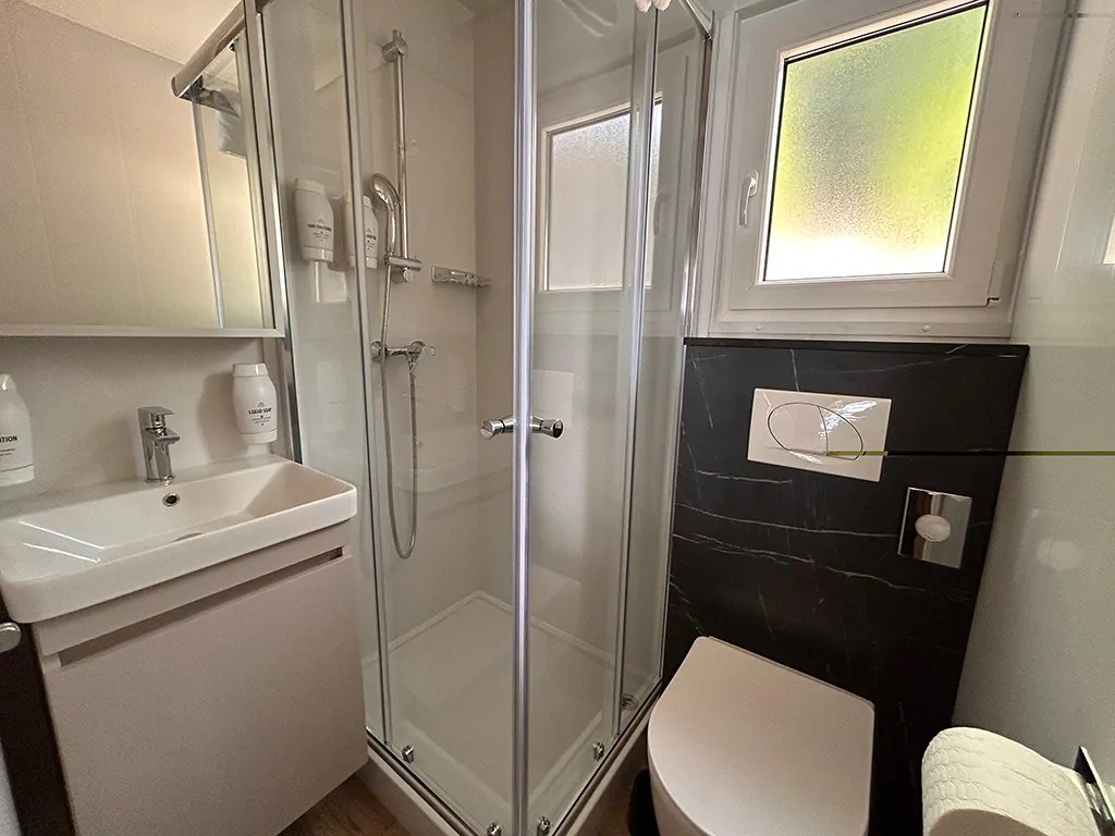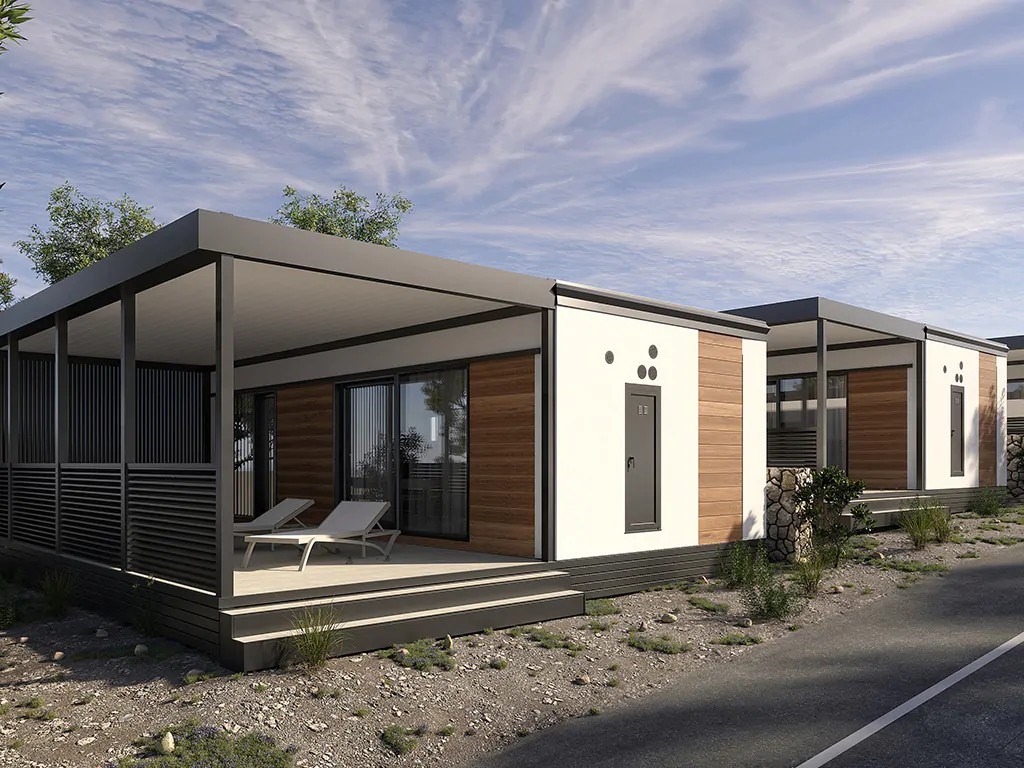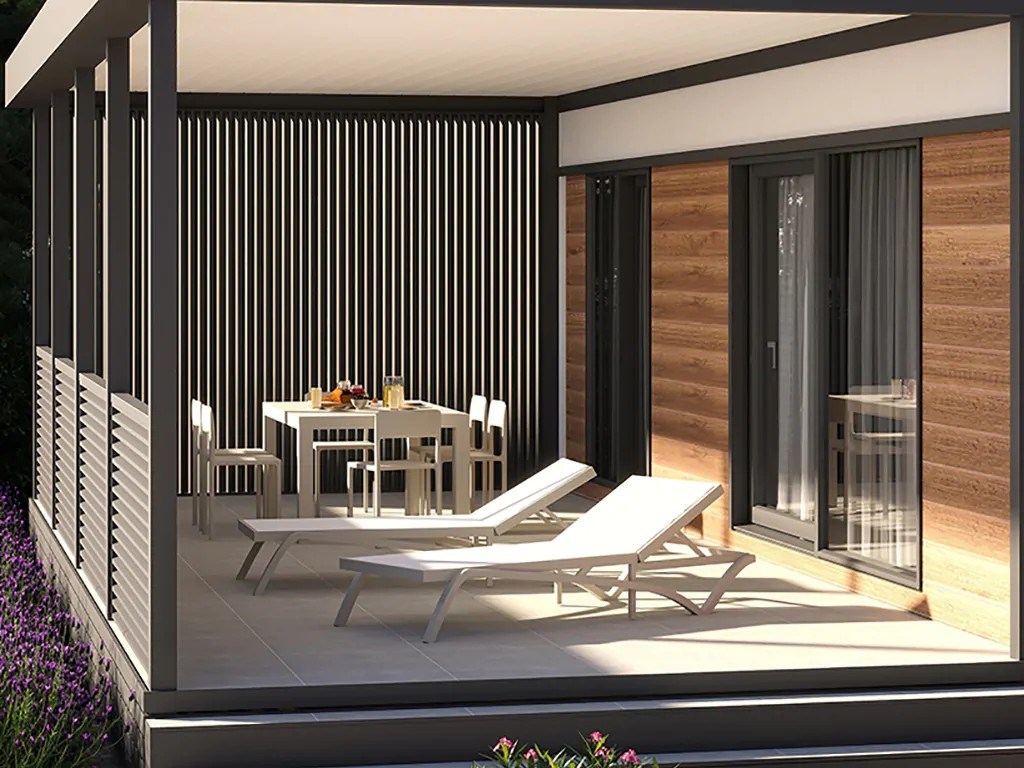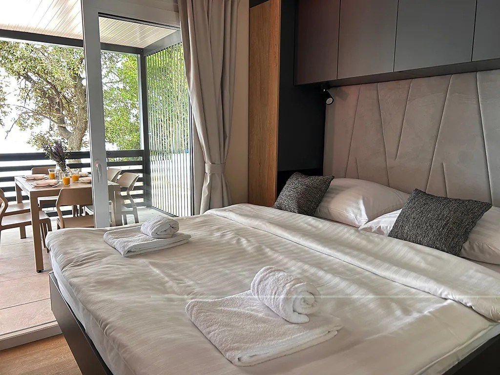 Mobilní domek Superior pro 4-6 osob - má dvě ložnice, obývací pokoj s přistýlkou (formou pohovky pro 1 dospělou osobu nebo 2 děti), plně vybavenou kuchyňku (včetně myčky), 2 koupelny, klimatizaci, WiFi a SAT/TV.
