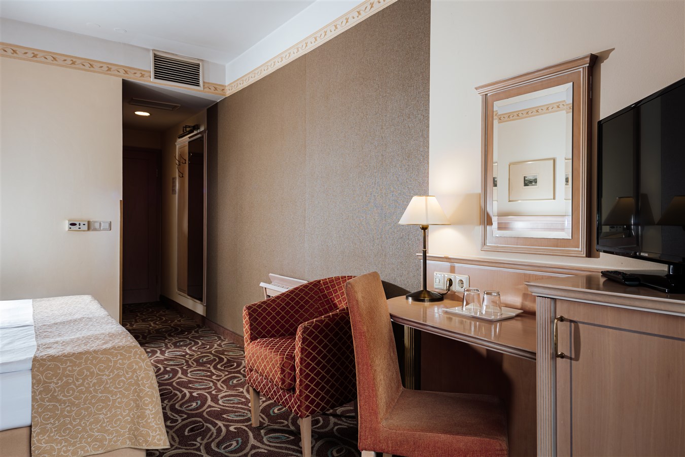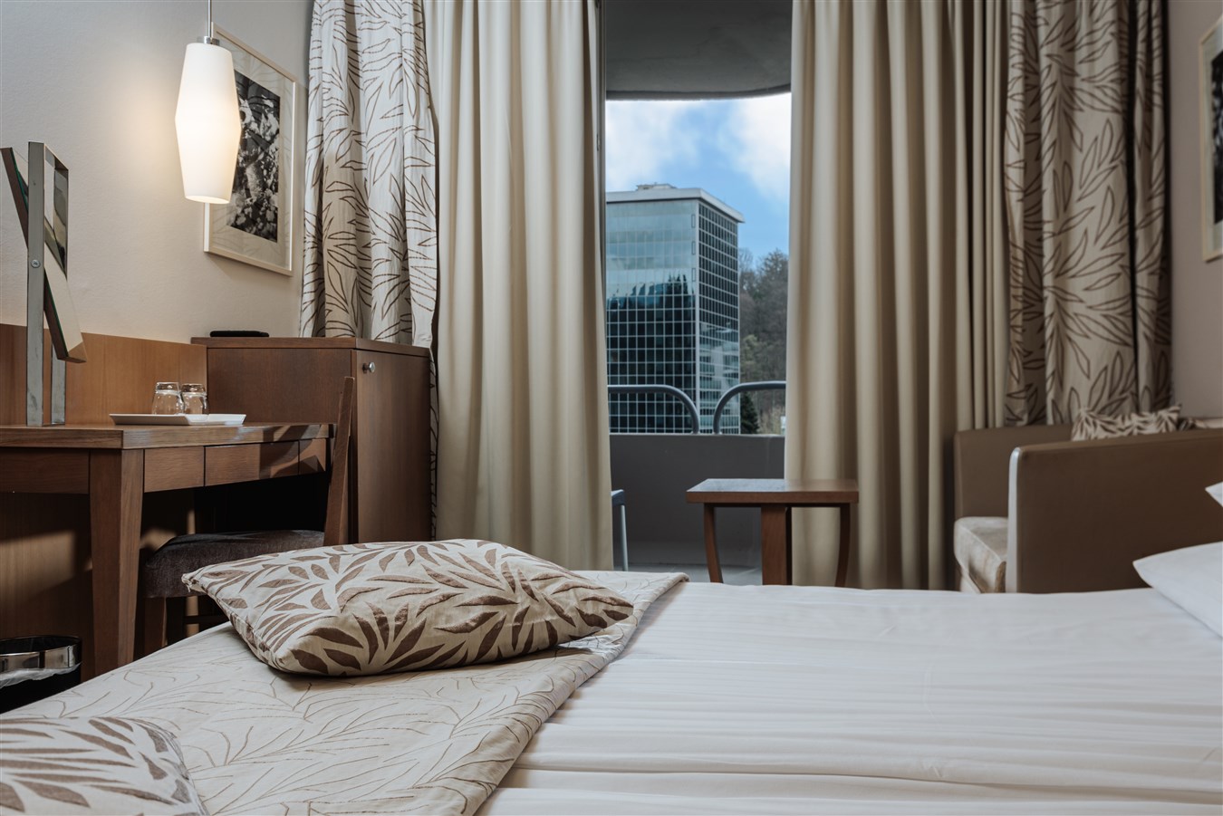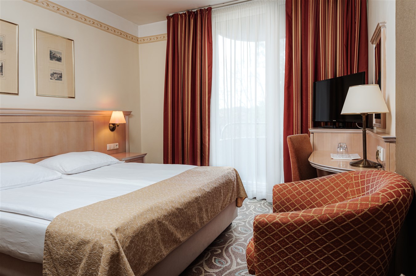 Klimatizované dvoulůžkové pokoje, některé s možností přistýlky. Pokoje mají vlastní koupelnu se sprchovým koutem a toaletou a jsou vybaveny vysoušečem vlasů, minibarem, trezorem, LCD TV Sat, Wifi připojením, telefonem. Některé mají balkon. Na vyžádání je možné zajistit pokoje suite nebo junior suite.