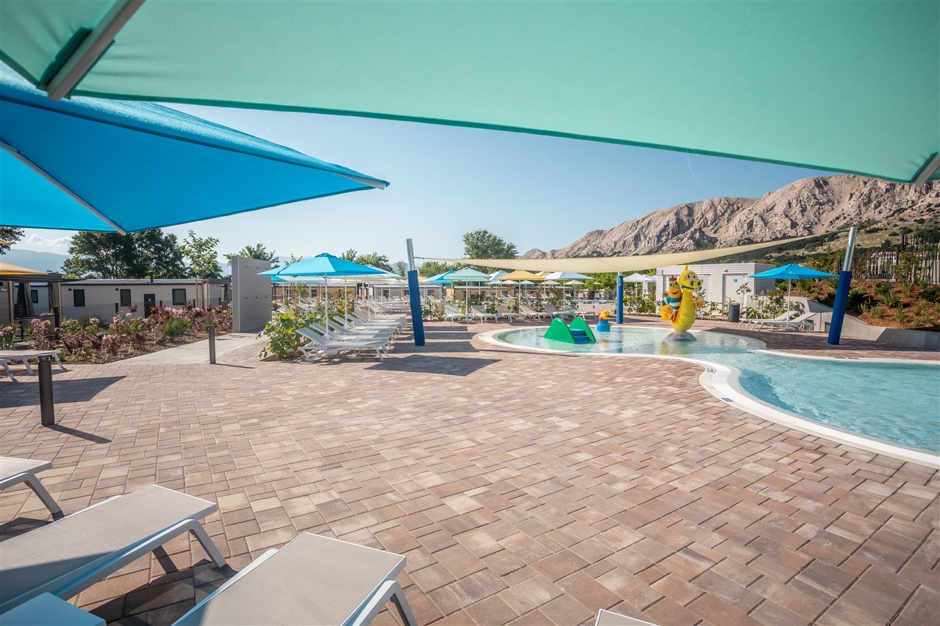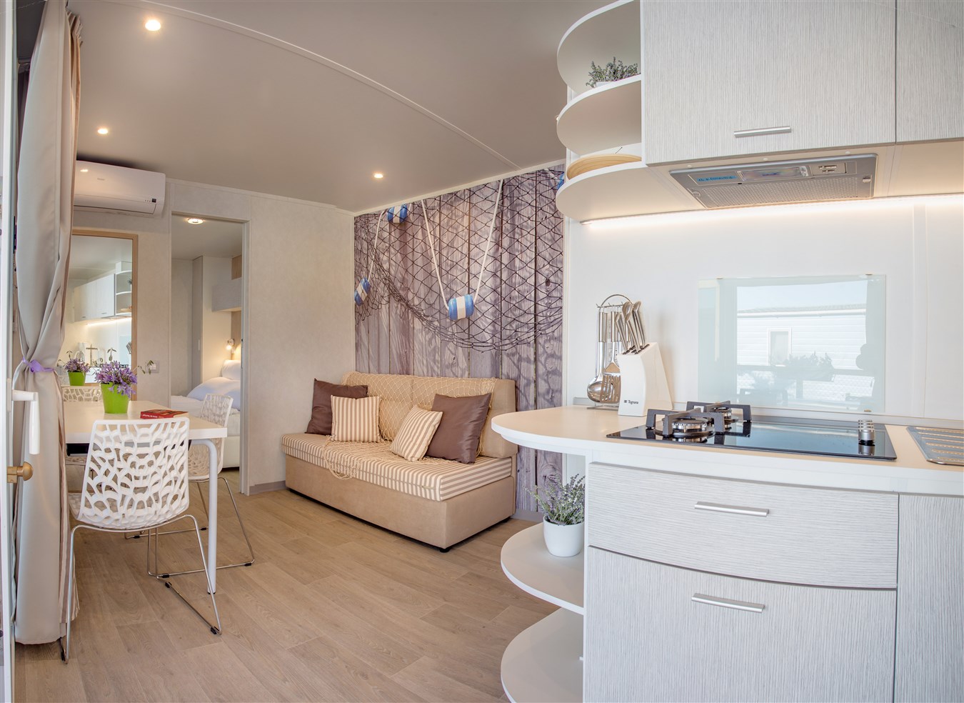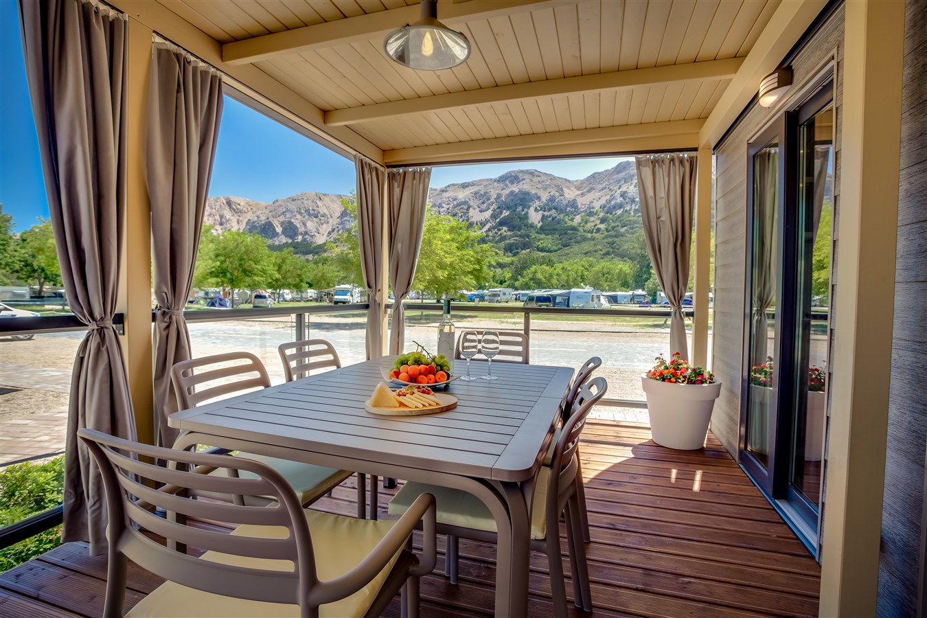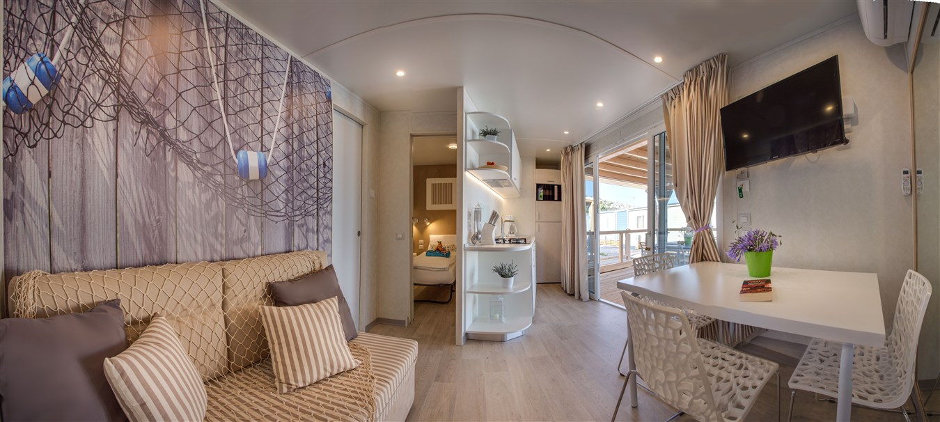 Mobilní domky pro 4-6 osob - 2 ložnice (1 ložnice s francouzskou postelí, dětská ložnice s dvěma oddělenými postelemi o rozměrech 80 x 200 cm), vybavená kuchyňka s jídelnou, 2 koupelny se sprchou, prostorná terasa s posezením a lehátky, klimatizace, Wi-Fi, trezor.